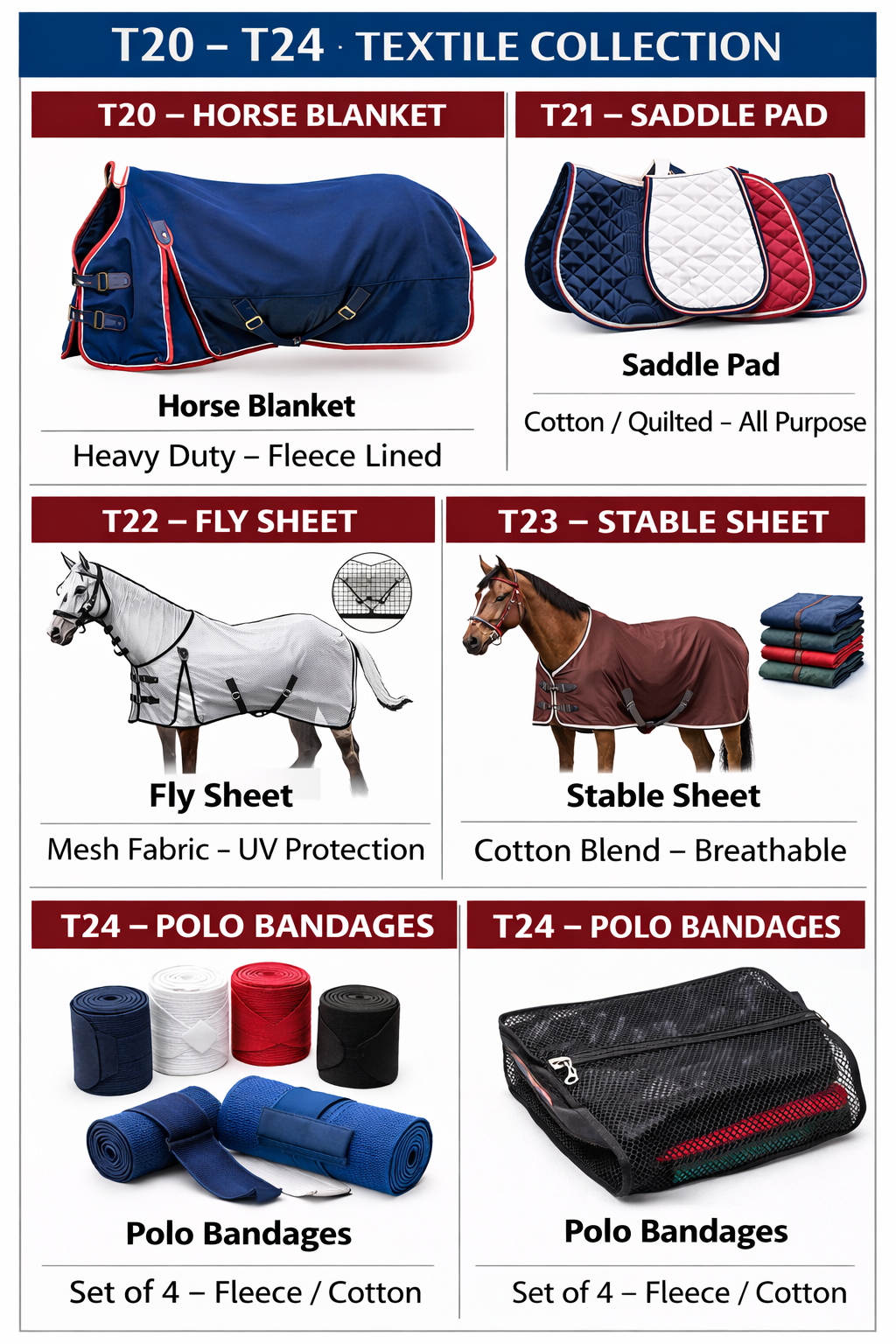 Our textile and leather accessory ranges are designed considering performance riding requirements, durability standards, and aesthetic branding demanded by international equestrian markets.
